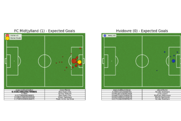 Visualisering af XG-begivenheder i f.eks. Superligaen ved et Shot Plot med xg-tabel, resultat og målscorer markeret.
